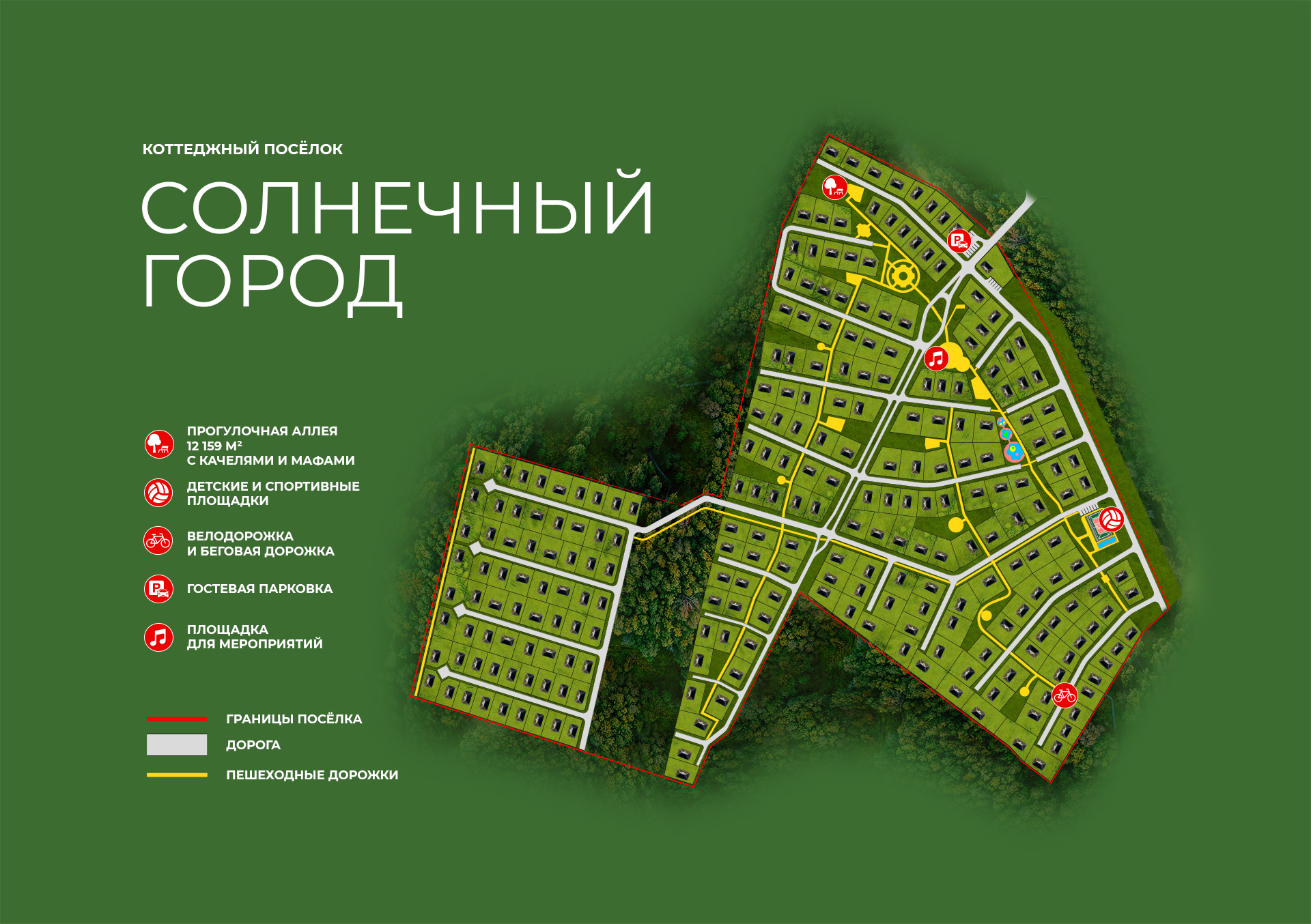 Мы создали все условия для вашего удобства: прогулочные аллеи, стабильный проводной интернет в каждом доме, детские площадки, спортивные зоны и многое другое