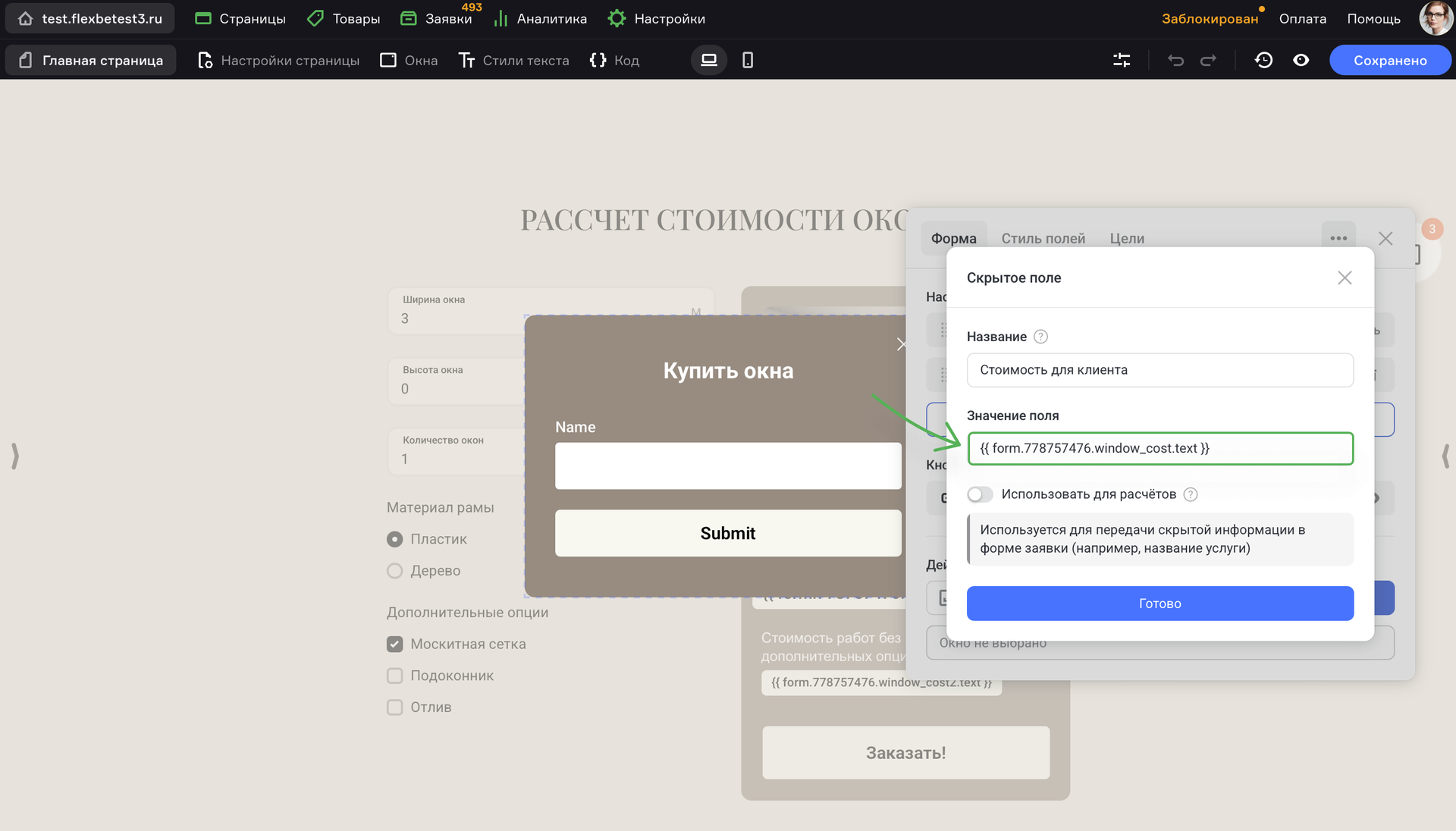 {{ form.ID.variableName.value }} или {{ form.ID.variableName.text }}; - 4 Значения полей калькулятора можно выводить в Скрытое поле другой формы на странице;