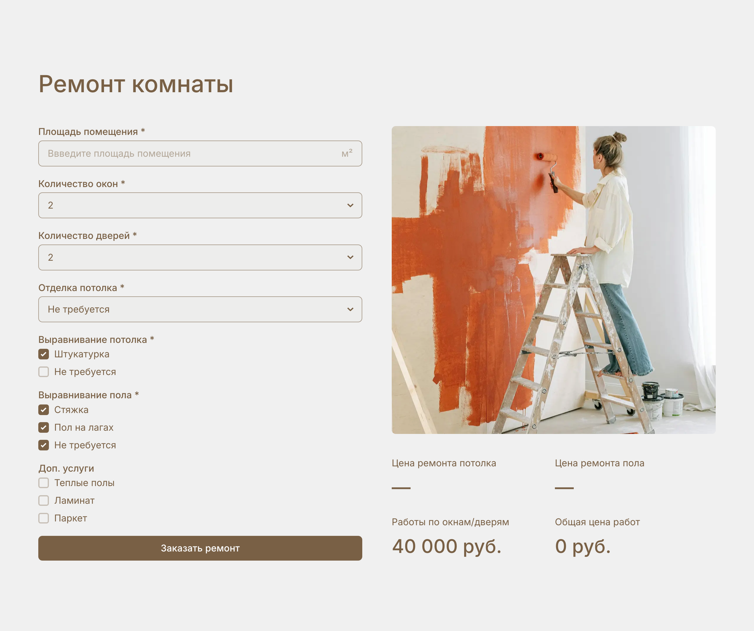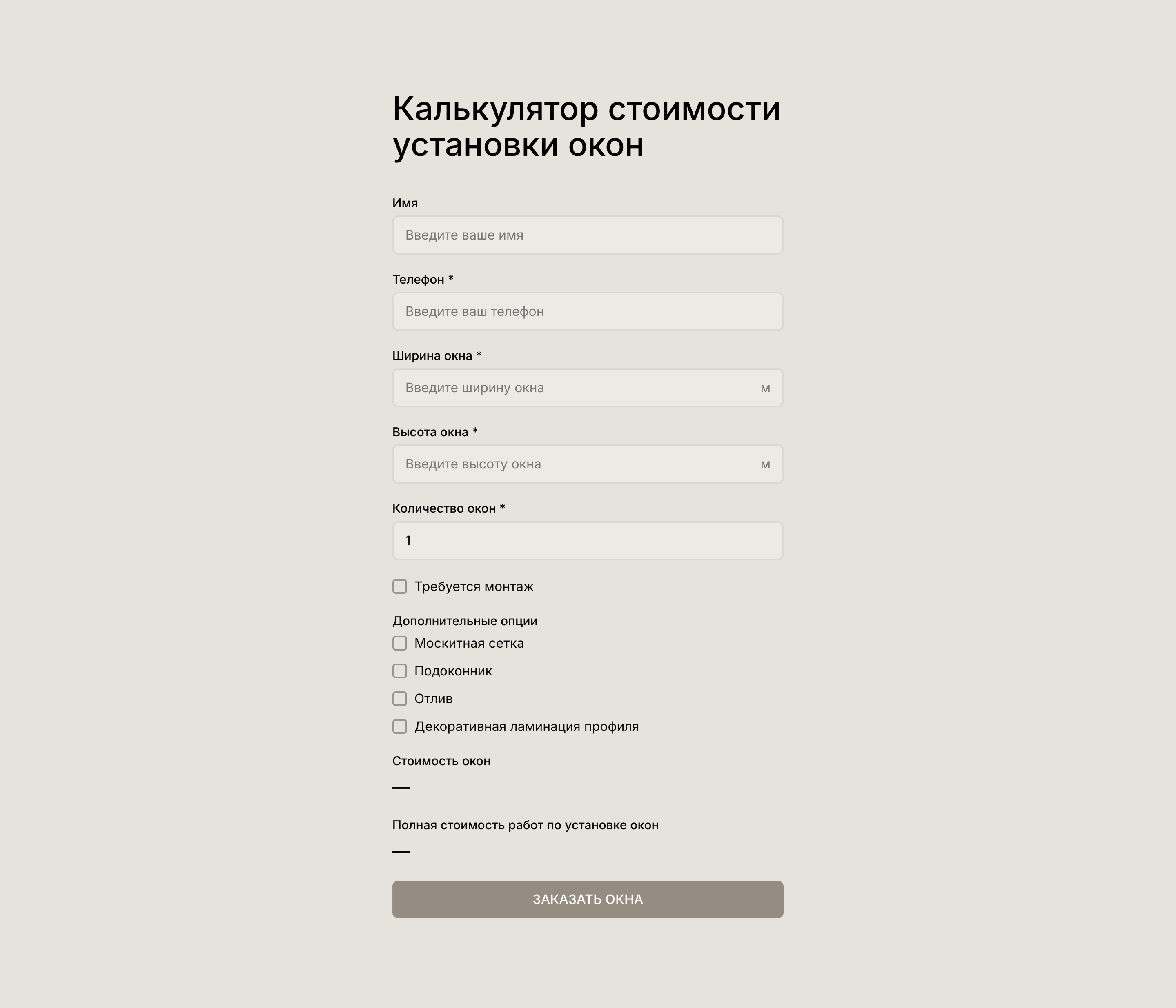 Теперь калькулятор отображает расчет стоимости окна в реальном времени, используя данные, которые ввел клиент.